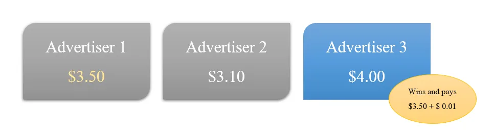 In the example above, Advertiser 3 wins the auction with a bid of $4.00. The cost, therefore, of the click charged to Advertiser 3 will be $3.51- if their ad is clicked upon.